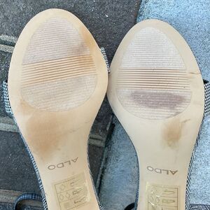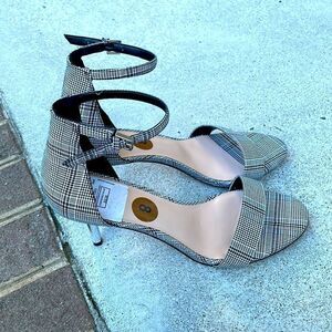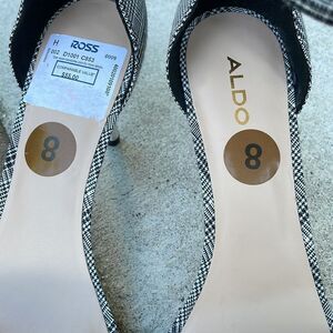 Aldo black and white Glen plaid heels. Size 8. In very good preowned condition. No stains. Very minimal wear. Open toe. Ankle straps. 2 inch heels. The Ross sticker is still on. When I went to pull it off it looked like it was going to pull off a piece of padding so I left it. Comes from a smoke free home.