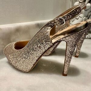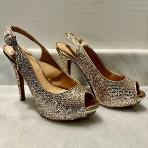 Aldo Britany Sparkly Peep Toe Slingback Stiletto Heel Platform Pumps Gold Size 7