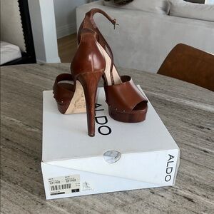 Elevate your style with these sophisticated brown block heel sandals from Aldo. Featuring a smooth leather finish and a chic ankle strap design, these heels are perfect for both casual and dressy occasions. The platform sole adds comfort and a modern touch to your ensemble.