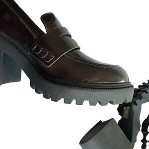 Step up your style with these chic Aldo loafers. Crafted in a rich brown faux leather with a glossy finish, they feature a classic penny loafer silhouette elevated by a chunky block heel and lugged sole for modern edge and all-day comfort. Perfect for pairing with jeans, trousers, or dresses, these versatile shoes blend timeless sophistication with a bold contemporary twist.