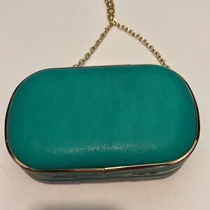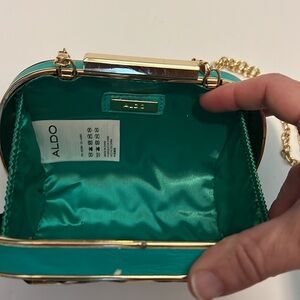 Like new Aldo clutch with removable gold chain shoulder strap. Clean inside. Small white spot on the top where the turquoise leather peeled from gold trim. See pic.