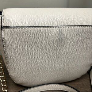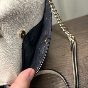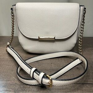 Elegant cream crossbody bag. Features a gold chain strap. Perfect for any occasion.