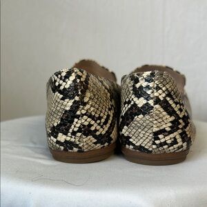 These Aldo loafers feature a sophisticated snake print in cream and black, offering a chic and versatile style. The pointed toe and flat sole provide comfort and elegance, making them perfect for any occasion. Crafted with attention to detail, these shoes combine classic design with an exotic twist.