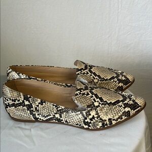 These Aldo loafers feature a sophisticated snake print in cream and black, offering a chic and versatile style. The pointed toe and flat sole provide comfort and elegance, making them perfect for any occasion. Crafted with attention to detail, these shoes combine classic design with an exotic twist.