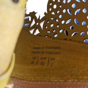 Aldo Cutout Fashion High Heel Open Toe Bootie, Yellow/Mustard Color, Size 9, Heel 4 1/2 inch. Used, Light Scuff on Right Inner Heel. Used and Still in Very Good Shape.
