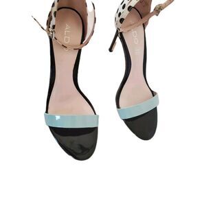 Aldo Dress Sandal 8.5 High Heeled Patent Leather Ankle Strap Polka Dot 4 Inch. Pre-owned, worn once excellent condition in terms of bottom, pictures show shoe glue and nick on black patent leather heal, wouldn't know if you weren't looking for it.Super cute, high heel, 4 inches.