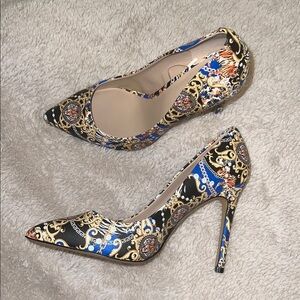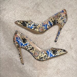 Step out in style with these elegant multicolor stiletto heels. Perfect for any occasion, these shoes feature a stunning blend of black, blue, and gold, adding a touch of sophistication to your outfit. Brand new, never worn other than to try on. See photos for condition.