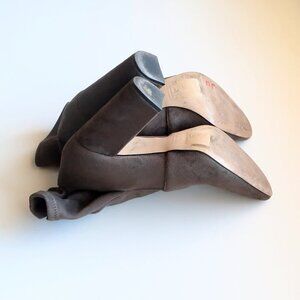 The essential almond-toe ankle length sock boot in forest green with taupe hue. Impeccably crafted vegan suede molds to flatter the foot in an elegant, timeless silhouette. Inside zip closure. The wearable, comfortable high, wrapped block heel is ultra-versatile, pairing effortlessly with denim, leggings, or skirts.