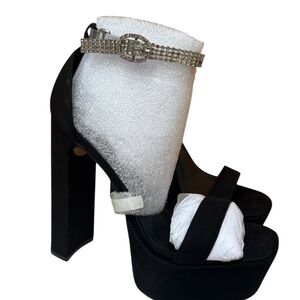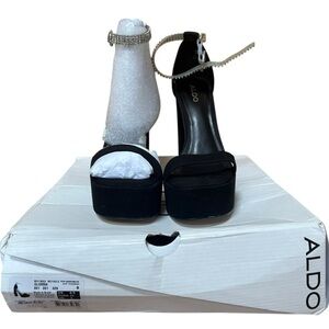 Step into elegance with Aldo's black heels, featuring a dramatic chunky heel and a sleek platform sole. The minimalist design is accentuated by a wide toe strap and a metallic buckle ankle strap, making them perfect for formal occasions. Tried on comes in OG box.