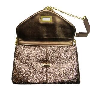 Aldo Sparkle Gold Glitter Crossbody. Golden Bronzey Color Full Glitter Super Sparkly Rectangle Crossbody Bag with Solid Faux Leather Copper Brown Back. Gold Hardware and Gold Chain Strap with Faux Leather Strap Pad.