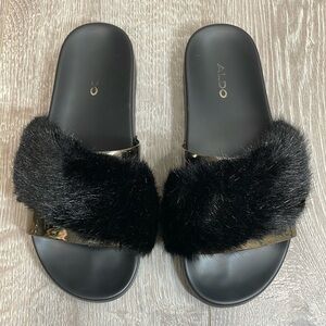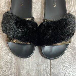Aldo Gotta Black & Metallic Faux Fur Slide Sandal in size 7.5. Great preowned condition. Please see photos for details. Item may show difference in color based upon photography and perception. Photos are part of the description, as everyone’s level of condition may vary. From smoke free and pet free home. All packages are shipped the same or next business day.