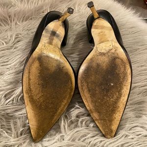 These genuine leather heels are in great shape. The cut makes them. Any slight flaws are in pics. The heel is silver with black rubber on bottom. The rubber little bottom could use replacing soon. A few white specks inside one shoe. All shown in pics.