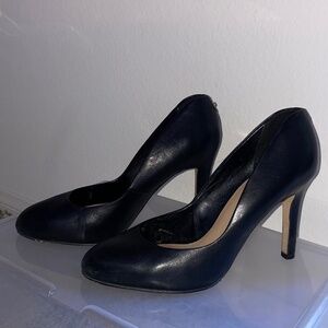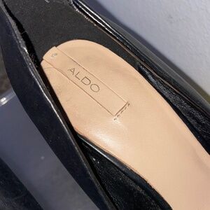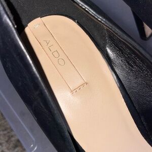 Elegant and comfortable mid-heel pumps by ALDO in classic black leather. Rounded toe with a sleek silhouette and modest heel height for everyday wear. Smooth leather upper and neutral beige insole.