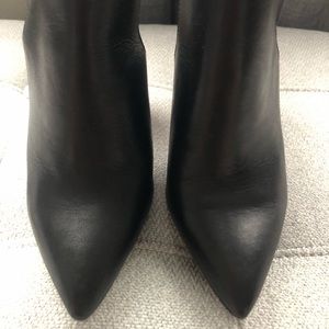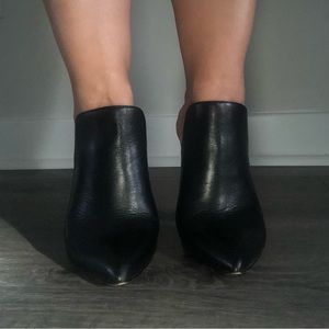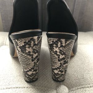 Aldo Pointed Toe Slip Om Mules/Block Snakeskin Heel. Leather. Size 7; Black/White/Grey