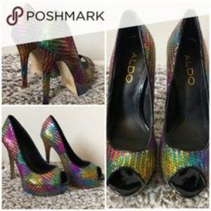 Aldo Rainbow 🌈 Sequin Platform Stilettos 5" heel, peep toe, platform, stiletto shoes.