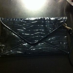Navy patent leather envelope style clutch. Has detachable wrist band to be worn as a clutch or wristlet.