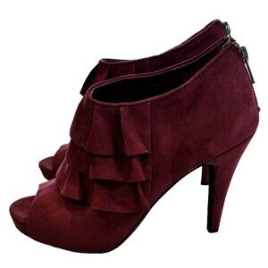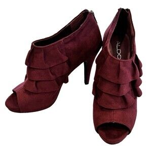 The Aldo Open Toe Suede Heeled Zip Booties in size 39/8.5 are stylish and trendy ankle boots perfect for women. Featuring an open toe design and a zip closure, these booties are made from faux suede in a burgundy color. The 8.5 US size and 39 EU size ensure a comfortable fit for your feet, making them a versatile and fashionable choice for any outfit. Perfect for adding a touch of sophistication and flair to your wardrobe.