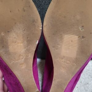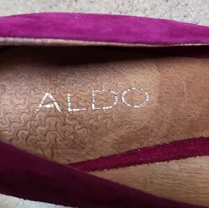 These Aldo wedges feature a vibrant pink hue and a classic suede finish, offering a perfect blend of style and comfort. The medium-height wedge heel provides an elegant lift, making them ideal for both office wear and casual outings. With a minimalist design and a rounded toe, these shoes are a versatile addition to any wardrobe.