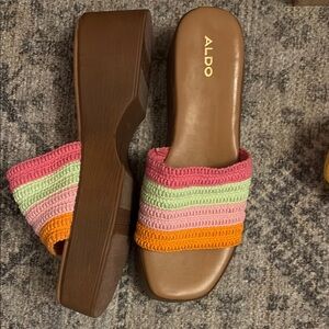 Experience the vibrant charm of Aldo's slide sandals, featuring a delightful blend of pink and orange hues. These sandals boast a simple slip-on design with a wide band, perfect for casual summer outings. Enjoy the comfort of a flat sole and open-toe style, ideal for warm weather adventures.