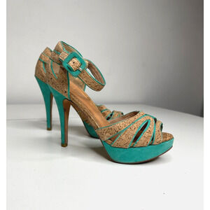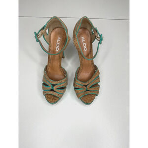 Aldo Platform Turquoise Suede & Tan Cork Stiletto Heel Ankle Strap Sandal 5.5