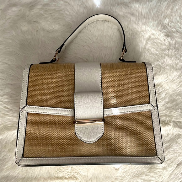 White, man made leather with raffia cover. Sturdy square bag with shoulder strap included.
