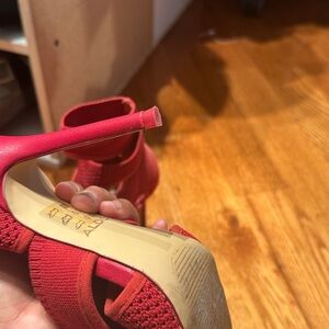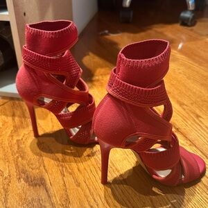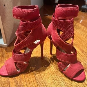 Stylish red high heel sandals with strappy design. Perfect for a night out. Size 5.5