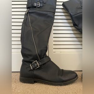 Knee high riding boot style with silver hardware and buckles