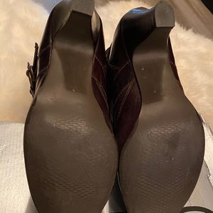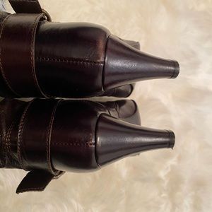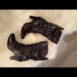 Aldo Ritter boot in brown. Dark brown distressed leather boot with side strap/buckle detail. Wear with dress, skirt, shorts, jeans, or leggings. Wear every season, but would be exceptional with any fall wardrobe. Purchased several seasons ago; worn only a few times with very minor wear to bottoms. In EXCELLENT condition.