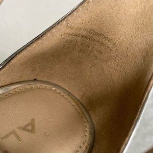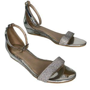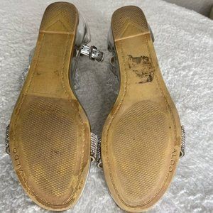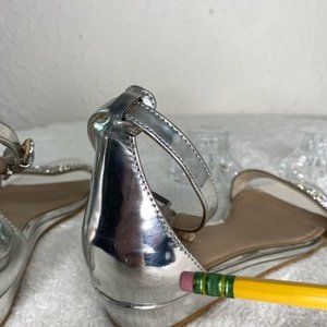 Elegant silver sandals by Aldo. Features a rhinestone-embellished strap. Perfect for special occasions.