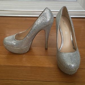 Gorgeous glittery silver heels size 37 from aldo! Worn a couple of times - proms, sweet sixteen. Super comfortable! Insoles in shoes have left black marks by balls of feet and scuffed bottoms from typical party wear.