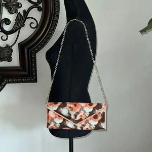 Sling bag by Aldo is a fun, on-trend multicolor handbag featuring a gold tone chain and an abstract design. Shiny, silk-like material in dark brown, orange, peach, and a splash of turquoise. In EXCELLENT condition!