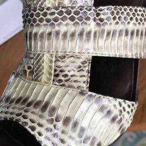 Beautiful taupe and off white snake skin sandals with dark wooden stacked heel. In almost perfect condition. Comes in original box!