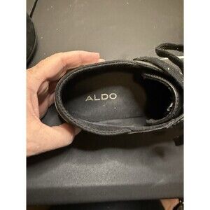 The Aldo Stephanie Women's Size 8M Perforated Lace Up Collapsible Heel Black Sneakers are stylish and comfortable casual shoes designed for everyday wear. These sneakers feature a low top shaft style with a lace-up closure for a secure fit. The black synthetic upper material is accented with perforated details, adding a touch of style to the solid pattern design. With a 1" platform heel style and cushioned comfort features, these sneakers are perfect for athleisure activities and adding a trendy touch to any outfit. SMOKE FREE HOME