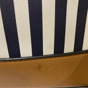 Stylish crossbody with navy stripes. Features brown accents and a rope strap.