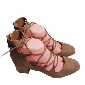 Style: Tan Suede Round Closed Toe Lace Up Block Heels