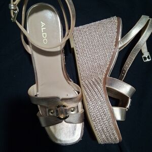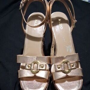 Step into elegance with Aldo's tan and gold sandals, showcasing a sophisticated strappy design. These sandals feature a secure ankle strap closure and a shimmering metallic finish, perfect for semi-formal occasions. Enjoy comfort and style with their chic, flat sole.