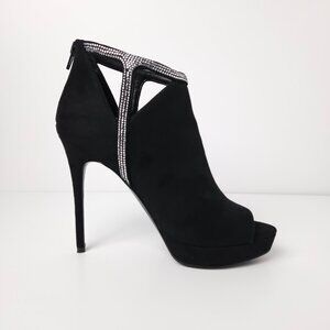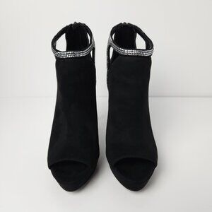 Aldo Tilasa Black Suede Peep Toe Ankle Boot Heels Silver Rhinestones - 7.5