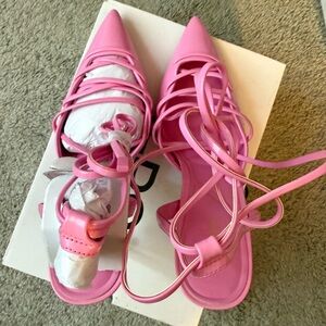 Bold pink heels with elegant straps. Perfect for a stylish look.