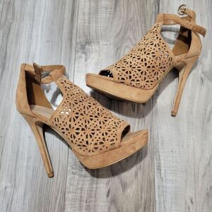 Aldo Vizzola heeled peep toe sandal. Approx 5” stiletto heel, 1” platform.
