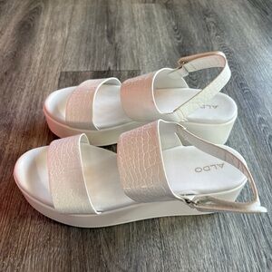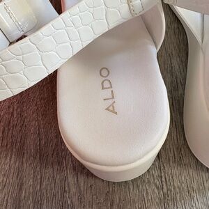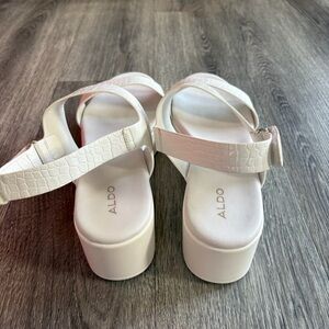 Elevate your summer style with Aldo's white platform sandals, featuring a chunky sole and wide straps for a modern look. These sandals offer a comfortable cushioned footbed, making them perfect for casual outings. The minimalist design ensures they pair effortlessly with any outfit.