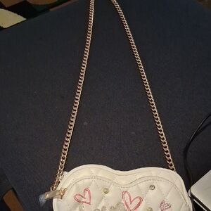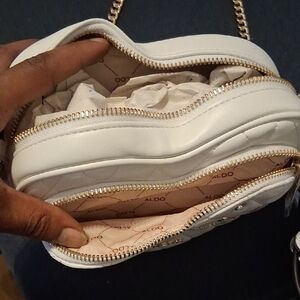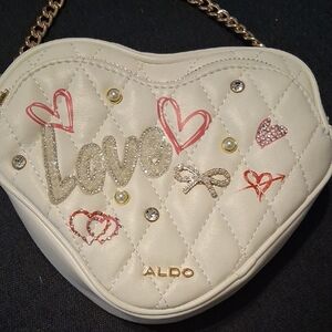 This charming mini bag by Aldo features a heart-shaped design in elegant white and gold tones. Its compact size and metallic chain strap make it a perfect accessory for a chic and playful look. Ideal for adding a touch of romance to any ensemble.