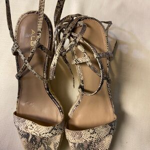These Aldo wedges feature a chic strappy design in a sophisticated white and tan color palette. The shoes are crafted with a comfortable wedge heel, perfect for adding height without sacrificing stability. Ideal for both casual and formal occasions, these wedges offer a stylish and versatile addition to any wardrobe. Very good condition