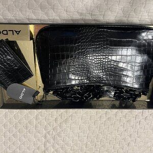 This is a small black faux leather Aldo Griregann purse. Chain shoulder strap. New with tags and in box. Zipper closure. Black interior. Can be used as crossbody or shoulder bag.