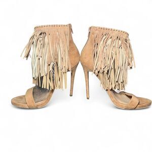 Aldo Women’s Size 6.5 Fringe Suede Stiletto Heels Sandals Tan Boho Festival Shoes