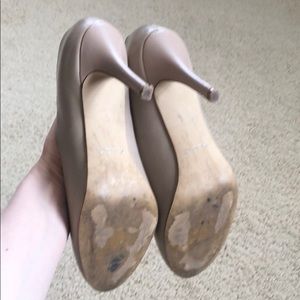 These are great, classic beige or tan or “nude” heels by Aldo. Simple design with stiletto heel and almond toe. Surprisingly comfortable. Really elongate the legs. Leather upper. Gently used with wear on the soles and heels as shown. Heel height approx 3.75.” Size 8.5 US.