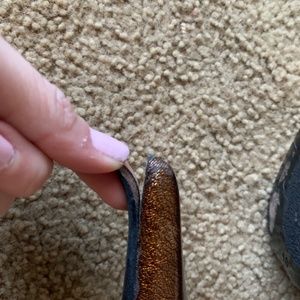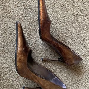 Size 40 bronze ALDO collection heels worn once they have cushions inside and sole grips on the bottoms at shown in picture. VERY POINTY the tips of both shoes are lifting a little as well as also shown in the pictures.