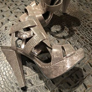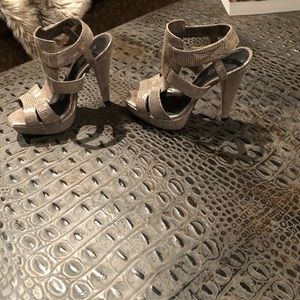 Like New!! Worn Once!! Aldo beige with silver tone heels. Gorgeous unique print!! Made for Bakers shoes.