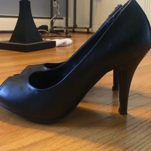 Black shoes, in AWESOME condition. Barely worn- I don't find high heels comfortable or easy to walk in, so after a few hours of wear I ditched them. I wore them outside and there is a tiny bit of scuffing on the bottom of the shoes so I can't return them. They are so cute and deserve a better home (hopefully with someone with better coordination than me)!