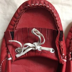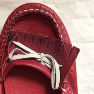 Red boat shoes with white laces and soles Fringe detail at top Never worn
