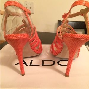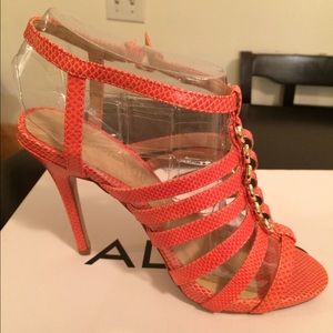 Nice orange high heels with a beautiful gold trim that runs in the middle of the shoe. The bottom part is just plain dirt. Worn a few times but are in good & perfect condition as you can see from the pics.